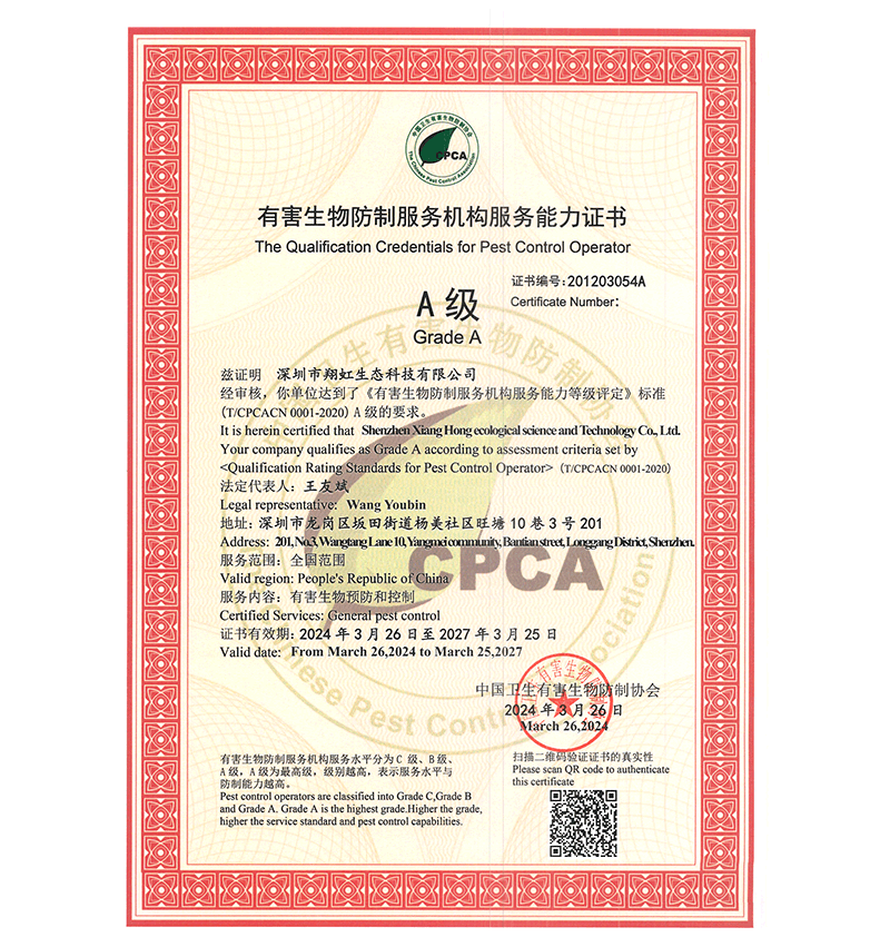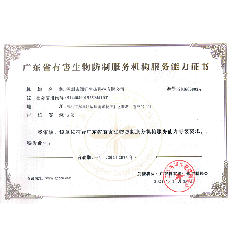 深圳市翔虹生態(tài)科技有限公司成立于1995年,是深圳最早成立的專業(yè)蟲害防治公司之一。公司發(fā)展至今獲得全國有害生物防制服務(wù)A級資質(zhì)、廣東省有害生物防制服務(wù)A級資質(zhì)、深圳市有害生物防制服務(wù)A級資質(zhì)、廣東省有害生物防制服務(wù)A級資質(zhì)、深圳市有害生物防制服務(wù)甲級資質(zhì)的單位,是中國有害生物防治協(xié)會會員、廣東省有害生物防治協(xié)會會員、深圳市有害生物防治協(xié)會理事單位,多次獲得“深圳市十佳消殺單位”榮譽。